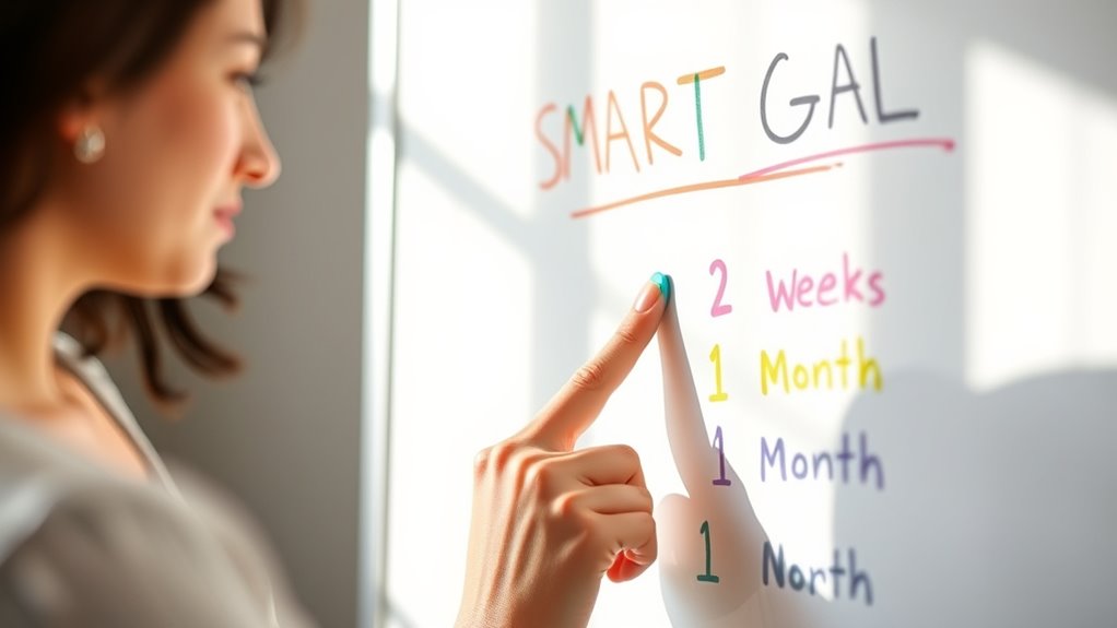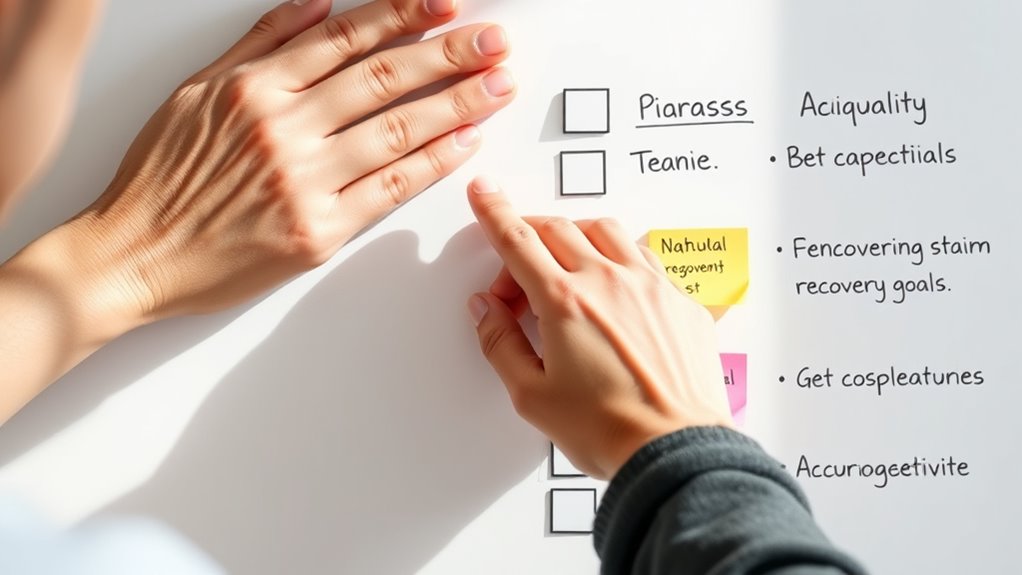 Establishing clear time frames for your recovery goals is essential to track progress and stay motivated. Progress milestones break down your overall recovery into manageable steps, making it easier to measure success. They help you identify what’s working and where adjustments are needed. To maximize effectiveness, consider these key points: