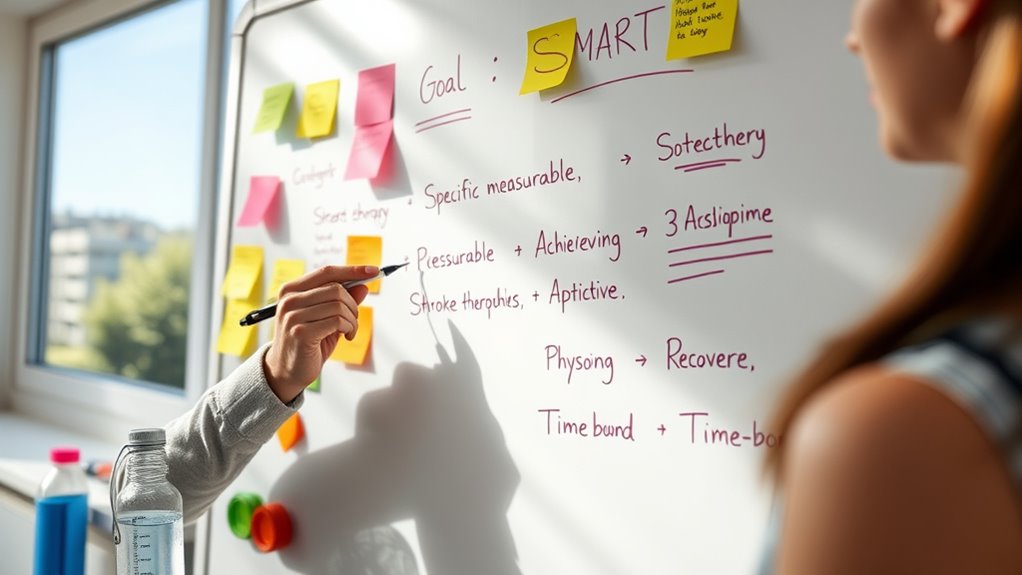 Creating measurable targets is essential for tracking your progress and staying motivated throughout your recovery. When you set clear, quantifiable objectives, you know exactly what to aim for and can gauge your improvements. To craft effective targets, consider these steps: